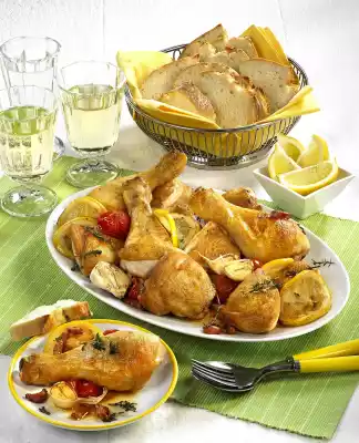 Halve 2 garlic cloves. Heat oil in a pan with a high rim. Fry the chicken pieces in it until golden brown and take them out. Sauté bacon and garlic in the frying fat. Add thyme and lemon slices. Add the chicken and mix everything carefully. Deglaze with vegetable stock. Cover the chicken and stew it for 25-30 minutes at medium heat. Wash the tomatoes. Add the tomatoes 10 minutes before the end of cooking time and continue cooking in the open pan.