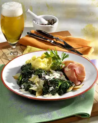 Drain the potatoes, mash them with a potato masher and add the milk-fat mixture. Season to taste with salt and nutmeg. Serve the kale, mashed potatoes, sauce and ham on plates, garnished with pink berries and parsley as desired.