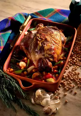 Wash the chickpeas, soak them overnight in 1/2 litre of water. Wash leg of lamb, dab dry, rub with oil, salt and pepper. Place in a large ovenproof dish. Chop the tomatoes in the tin with a knife. Arrange the tomatoes and chickpeas around the leg.
