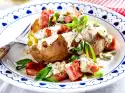 For the crust, select the spinach, wash and shake dry. Fry the rest of the garlic and onions in 1 tbsp. hot oil. Add the spinach and allow to collapse briefly. Season with salt and nutmeg. Crumble the feta. Spread both on the stuffed peppers. Cover the tin with aluminium foil and bake in a hot oven for about 30 minutes. After about 20 minutes baking time, remove the foil and bake open to the end.