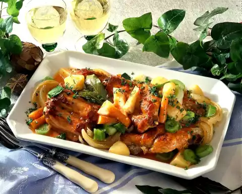 Clean, wash and cut the soup greens into small pieces. Steam everything in frying fat until transparent. Add bay leaf. Deglaze with white wine and stock. Let it boil down on high heat for five minutes. Add the rabbit parts again and braise covered in the preheated oven (electric cooker: 200 °C/ gas: level 3) for about one hour.