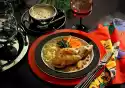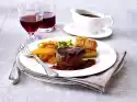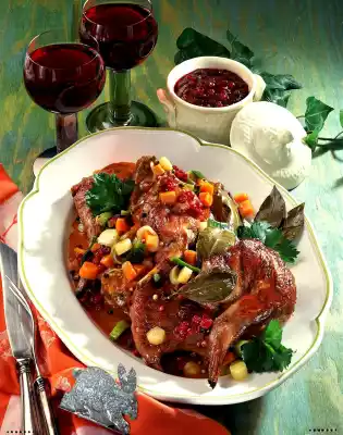 Stew for about 50 minutes. Remove the rabbit parts. Thicken sauce with sauce thickener, bring to the boil, season again and serve with cranberries. Serve garnished with celery green as desired.