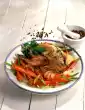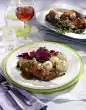 Add soup greens and onions and fry until transparent. Add cloves, laurel, crushed peppercorns and juniper. Deglaze with red wine, stock and vinegar. Add the rabbit pieces. Cover the roast and put it in the preheated oven (electric cooker: 200 °C/ gas: level: 3).