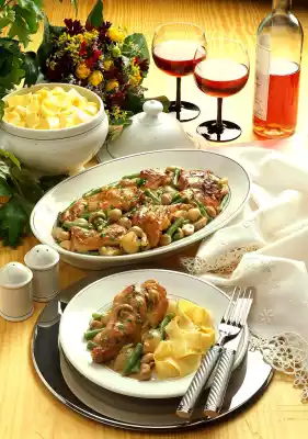 Heat the remaining fat in a pan and fry the champi-gnons. Add the beans. After 30 minutes add to the rabbit and continue to braise. In the meantime, boil up plenty of salted water for the noodles, boil the noodles in the bubbling water for 10-12 minutes.