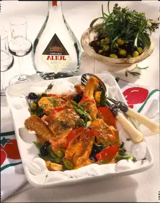 Deglaze with chicken stock, broth and cream, bring to the boil and simmer for 20-25 minutes. Stir carefully several times. In the meantime, wash the thyme, dab dry and pluck the leaves from the stalks. Add the remaining tomatoes and olives 5 minutes before the end of the cooking time. Stir in the sauce thickener, bring to the boil again and season to taste with salt, pepper and paprika. Arrange braised rosemary chicken pieces on a plate, sprinkled with the remaining rosemary and thyme. Serve with Grappa