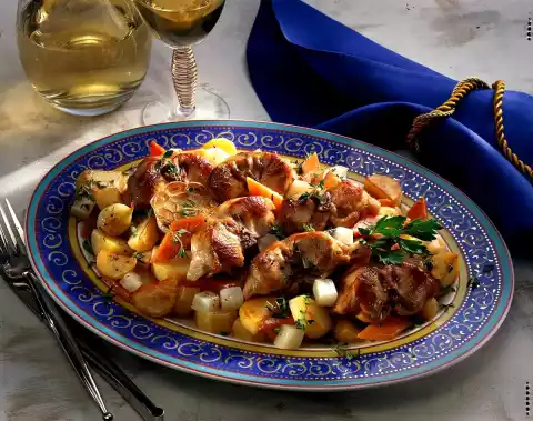 Braise the vegetables and garlic in hot frying fat, season with salt and pepper and deglaze with white wine and stock. Wash the thyme, dab dry and remove the leaves from the stems. Add the saddle of rabbit and thyme, except for a teaspoon, to the vegetables. Cover and stew for about 15 minutes. Season again with salt and pepper and arrange on a plate. Sprinkle with remaining thyme and serve garnished with parsley