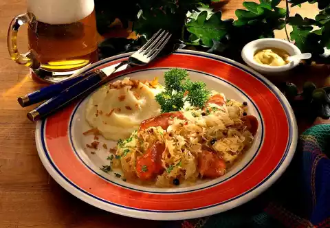 Then stir vigorously again. Sprinkle with remaining onions and parsley and arrange on plates with sauerkraut. Serve garnished with remaining parsley.
