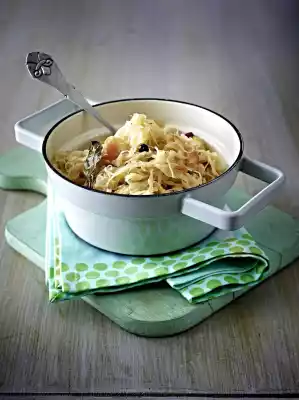 Peel and chop the onions. Fry in a large pot in hot oil. Sprinkle 2 tablespoons of sugar over it, let it melt. Add cabbage, bay leaf and juniper. Season with salt and pepper. Fry for 15-20 minutes.
