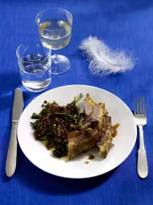 Season to taste with salt, pepper and nutmeg. Drain the lentils and mix in. Remove meat from the roaster. Pour frying stock through a sieve into a pot and boil down for 5-10 minutes. Add 1 tablespoon of olives.