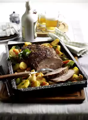 Distribute around the roast 40 minutes before the end of the cooking time. Season with salt. Peel onions and cut into slices. Peel and wash carrots, parsley root and celery and cut into evenly sized pieces. Clean, wash and cut the leek into rings. Lightly salt the vegetables and spread them on the tray. Turn in between. Wash parsley, shake dry and chop, except for a little bit for garnishing. Cut meat into slices and arrange on the tray with potatoes and vegetables.