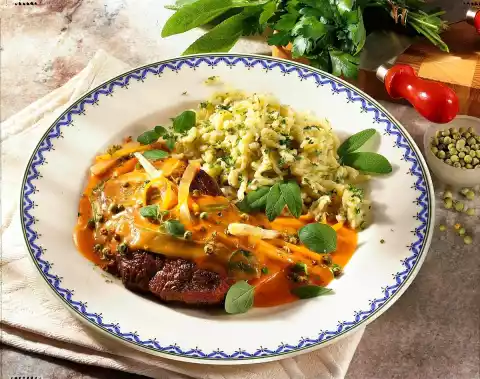 Add tomato paste to the pan, mix well with the frying fat, dust with flour and sauté. Deglaze with stock and red wine, bring to the boil while stirring and season with salt and pepper. Add green pepper and herbs. Add the meat to the sauce and braise for about 10 minutes. In the meantime peel onion and cut into fine strips. Clean and wash the vegetables, cut into fine strips and cook in boiling salted water for about 2 minutes. Take the vegetables out of the water and add them to the sauce. Stir the sour cream into the sauce. For the spaetzle wash the herbs, dab dry and chop finely. Put flour, eggs, salt, oil and 200 ml water into a bowl and work into a dough with the whisk of the hand mixer.