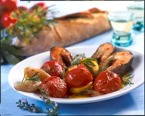 Clean and wash the tomatoes. Peel the shallots. Peel garlic and cut into thin slices. Wash herbs, chop coarsely. Heat 50 ml olive oil. Stew prepared ingredients in it at medium heat for about 30 minutes.