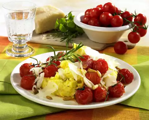 Stir the grated Parmesan into the polenta and if the polenta is too firm, add some water. Season polenta again with salt and pepper, arrange with the braised tomatoes and garnish with sliced Parmesan and rosemary.