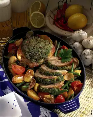 Spread the turkey leg with herb bread mixture and bake in the hot oven for approx. 5 minutes. Cut the turkey legs open and arrange them on the vegetables in the roaster. Serve garnished with parsley.
