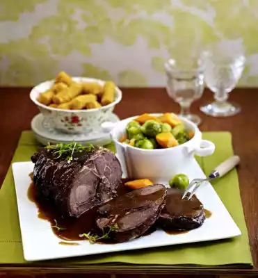 Wash the meat, dab dry, cut off fat as desired. Tie roast together with kitchen string. Peel garlic and chop finely. Mix with mustard and season with salt and pepper, brush the roast with it, let it stand for about 30 minutes