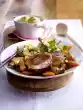 Finely dice the remaining onions. Peel and wash the carrots and cut them diagonally into thin slices. Heat butter in a pot. Add 200 ml water, onions and unfrozen Brussels sprouts, cover and stew for 7-8 minutes. Add carrots and steam for another 10 minutes, season with salt and pepper. Remove meat and keep warm. Pass the stock through a sieve into a pot. Stir in jelly, bring to the boil. Mix starch with a little water, thicken the simmering stock slightly, season with salt, pepper and possibly sugar. Arrange meat, vegetables and sauce. Serve with croquettes