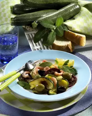 Fry the shrimps well, season with a few drops of lemon juice and set aside. Add the rest of the olive oil. Fry the garlic, dried tomatoes and zucchini for about 5 minutes. Turn carefully.