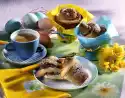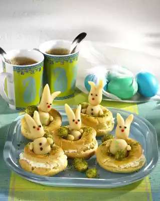The dough should fall off the spoon shiny and hard. Pour the mixture into a piping bag with a perforated spout and spray 6 circles (8 cm Ø) onto a baking tray lined with baking paper. Bake in a preheated oven (electric cooker: 225 °C/ convection oven: 200 °C/ gas: level 4) for 20-25 minutes. (Do not open the door during the first 15 minutes!) Let the fire dough nests cool down for 5 minutes, cut them open crosswise with a saw knife. Leave to cool down. In the meantime knead marzipan and icing sugar. Form 6 larger balls for the body. Roll 6 smaller balls, form them pointed at one end, cut the tip with scissors to form the rabbit ears. Form small paws from marzipan. Put them together with some water or egg white. Paint the rabbit's eyes, noses and buttons with brown, red and green sugar writing. Form small eggs from the remaining marzipan, brush with a little water and roll in 20 g of pistachios. For the cream, mix mascarpone, yoghurt, sugar and vanillin sugar.