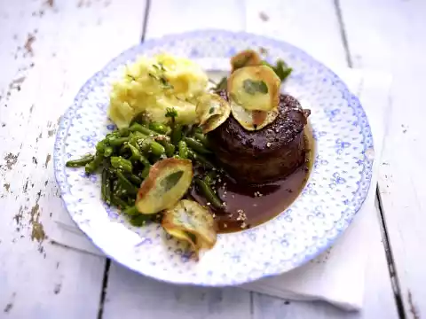 Fry the steaks in it at high heat for 1-2 minutes on each side, fry the bacon on all sides as well. Season with salt and pepper. Remove and place on a baking tray lined with baking paper.