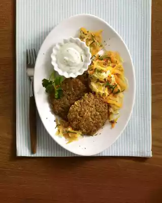 Mix the contents of the pack with 190 ml hot water. Mix well and allow to swell for 10 minutes. Peel, wash and grate carrots. Wash parsley, dab dry and put 2 stems aside for garnishing. Cut the remaining leaves into thin strips. Place the sauerkraut in a sieve and drain.