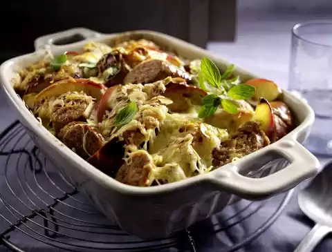 Grease a casserole dish. Layer pretzel sticks, sausages and apples in the dish. Pour marjoram cream evenly over it. Sprinkle with cheese. Bake in a hot oven for 35-40 minutes. Sprinkle the nuts over the casserole 10-15 minutes before the end of the baking time.