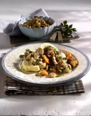 Season to taste with salt, pepper and sugar. Wash parsley, shake dry, pluck leaves from the stalks and chop. Cut the dumplings into slices with a twine. Arrange dumplings and ragout on plates and sprinkle with parsley.