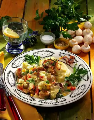 Peel and finely dice 1 onion. Clean and wash the mushrooms, dab dry and cut into slices. Cut the sausages into slices as well and fry them all around in hot oil. Add the mushrooms and onion and fry. Add the vegetables without defrosting and steam for about 3 minutes while stirring.