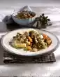Dust with flour and sauté. Add cream and stock, bring to the boil and cook over low heat for about 10 minutes. Season to taste with salt and pepper. In the meantime, bring 3/8 litres of water and salt to the boil and remove from the heat. Add milk, stir in puree flakes and let it swell for 1 minute. Stir again. Peel remaining onions and cut into rings. Fry in hot fat until crispy brown. Wash parsley, dab dry and chop. Add to the ragout.