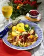 Stir again. Peel remaining onions and cut into rings. Fry in hot fat until crispy brown. Wash parsley, dab dry and chop. Add to the ragout. Spread the ragout with mashed potatoes on four plates. Spread onion rings with fat over the mashed potatoes