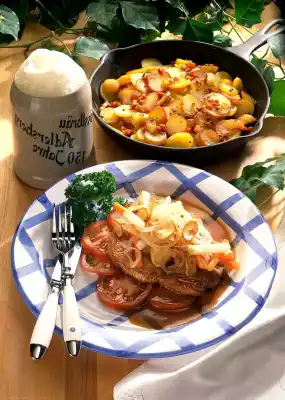 Fry the chops for 12 minutes while turning them, remove from the pan and keep warm. Bring the stock to the boil. Cook the carrots, onions and kohlrabi for about 5 minutes, drain and collect the stock. Deglaze frying fat with malt beer and vegetable stock. Add instant gravy while stirring, bring to the boil and season to taste with salt and pepper. Heat the fat and fry the mushrooms in it. Add drained vegetables and toss briefly in the fat. Clean, wash and slice the tomatoes. Arrange the chops on the tomato slices and add the vegetables.