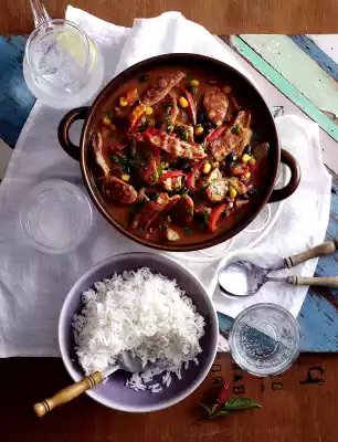 About 30 minutes before the end of the cooking time, add the paprika, corn, beans and chilli to the meat, season with salt and pepper. Add chorizo about 5 minutes before the end of cooking time. In the meantime, cook rice in boiling salted water according to the instructions on the packet.