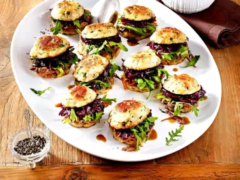 Pull skin from the clubs. Using a fork, remove the meat from the bone and fray it. Mix with the sauce. Clean the rocket, wash and spin dry. Cover half of the dumpling slices with some meat, sauce, red cabbage and salad.