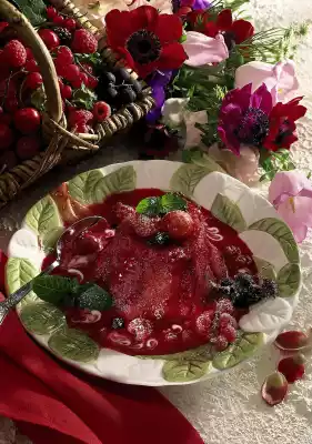Wash the currants. Strip the berries from the stems, except for a few panicles for garnishing. Wash and stone the cherries. Sort and wash raspberries and blackberries. Bring 200 g raspberries and other fruits, except for a few for garnishing, to the boil with 5 tablespoons of juice and leave to stand at low heat for about 5 minutes.