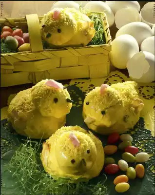 Stir egg white and sieved icing sugar until smooth (add a few drops of water if necessary). Colour yellow with food colouring. Cover the chicks with icing. Mark the "eyes" with currants, the "beak" with pistachios, the "wings" with browned almonds, the "comb" with pieces of jelly.
