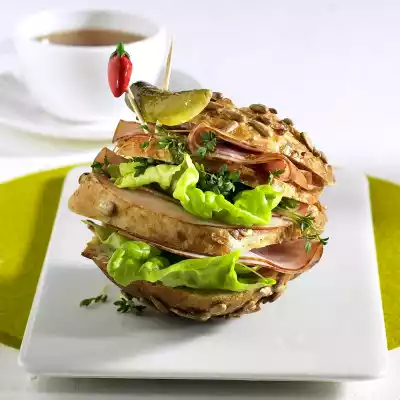 Wash and drain the lettuce leaves. Cut the buns 3 times. Alternately cover with salad and ham, sprinkle with cress. Spike the cornichon. Garnish bread roll with it and hold together.