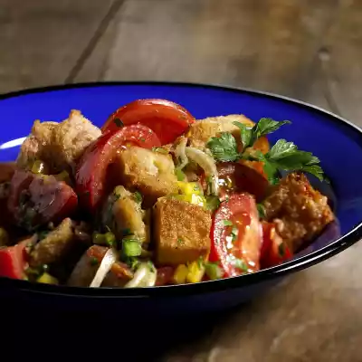 Cut bread into cubes. Heat 2 tablespoons of oil in a frying pan and toast bread in it until golden brown all around. Place in a bowl and sprinkle with 100 ml water. Wash, clean and slice the tomatoes. Quarter peppers, remove seeds, wash and cut into fine cubes. Peel and halve onion and cut into fine rings. Peel garlic and press it through a garlic press.