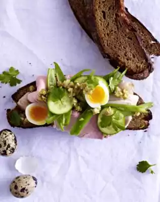 Spread slices of bread with butter, cover each with 1 slice of roast pork. Spread beans, cucumber slices and 1 egg each on top. Spread olive salad on top and sprinkle with parsley