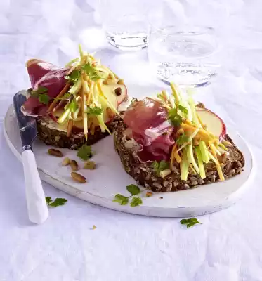 Wash the apple, grate dry, cut into thin slices and sprinkle with lemon juice. Wash the chervil, shake dry, pluck the leaves from the stalks. Brush each slice of bread with 1/2 teaspoon butter. Spread 2 apple slices, 1 slice of Parma ham and 1/4 Waldorf salad on each slice of bread. Sprinkle with chervil