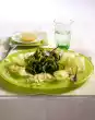 Clean, wash and drain the salad and herbs and pluck roughly into pieces. Chop shallot finely. Mix vinegar, diced shallots, mustard, salt, pepper and sugar. Fold in 2 tablespoons of oil.