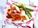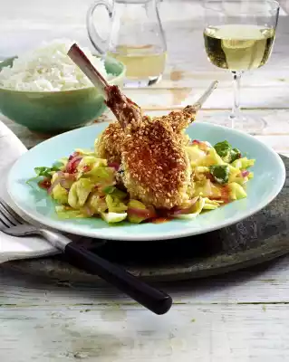 Heat 4 tablespoons of oil in a large frying pan. Fry 6 chops on each side for about 3 minutes until golden brown, remove. Add 2 tablespoons of oil to the frying oil and fry the remaining chops in the same way. Arrange pointed cabbage and meat on plates. Garnish with coriander. Add rice in a bowl
