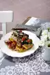 Meanwhile clean and wash the pointed cabbage and cut it into large pieces from the stalk. Peel and halve the onion and cut into fine strips. Heat 1 tablespoon of oil in a frying pan. Sauté the onion for about 3 minutes. Add the pointed cabbage and sauté for 5-8 minutes while turning. Add chilli sauce and season to taste with salt and pepper. Wash the coriander, shake dry and pluck the leaves from the stalks.