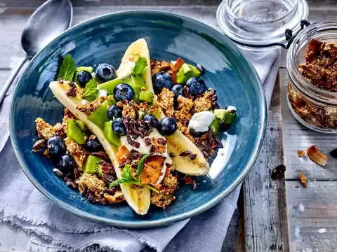 Spread 4 tablespoons of vegetable yoghurt alternative in 4 cereal bowls each. Place kiwi cubes, blueberries and 2 banana slices on top. Sprinkle with 3 tbsp. granola and 1 tbsp. maple syrup and garnish with fresh mint.