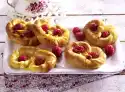Stir the jam and 4 tablespoons of water in a pot until smooth, bring to the boil, remove from the heat, allow to cool slightly, spread on muffins. Decorate with remaining blueberries, lemon zests and mint
