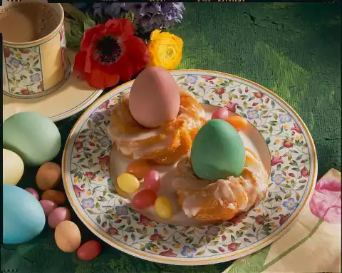 Turn once. Let drip off. Warm up the jam. Coat nests with it and let them dry. Mix icing sugar and lemon juice. Spread the pastry with it. Place coloured eggs in the nests as desired