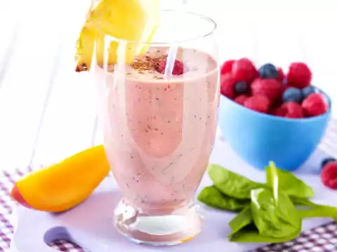 Finely puree the fruit, spinach and buttermilk and pour into glasses. Add linseeds and decorate with raspberries and pineapple slices. Serve immediately