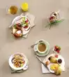 Pass the croissant with 2 teaspoons of strawberry jam. Cut the rolls in half. Spread 1 half with butter and honey. Spread 2nd half with nut nougat cream. Serve with strawberries and coffee with soy milk