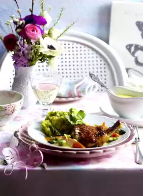 Peel carrots, slice lengthwise and then cut into pieces. Wash the asparagus and cut off the woody ends. Cut the asparagus into pieces. Peel and chop the shallots. Wash guinea fowl breasts, dab dry, rub with salt and pepper. Heat oil in a frying pan, fry breasts over high heat on the skin side until golden brown. Add honey and lemon juice, bring to the boil. Turn breasts and cook in a preheated oven (electric cooker: 100 °C/ convection oven: 80 °C/ gas: not suitable) for approx. 30 minutes.