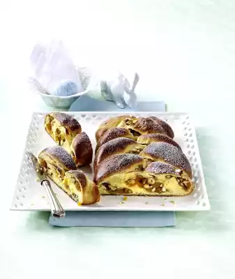 Cover and leave to rise in a warm place for about 30 minutes. In the meantime, cut the apricots into strips and marinate them in liqueur and orange juice. Coarsely chop the nuts. Knead nuts, apricots and jam. Knead the dough again and roll out into a rectangle (approx. 70 x 45 cm) on a floured work surface. Divide the rectangle into three parts lengthwise. Also divide the filling into three. Place the filling in the middle of each dough rectangle and spread lengthwise, roll up. Weave the 3 pastry rolls into a plait. Place the plait on a baking tray lined with baking paper. Whisk the egg yolk and brush the plait with it. Bake in the preheated oven (electric cooker: 200 °C/ convection oven: 175 °C/ gas: level 3) for approx. 30 minutes.