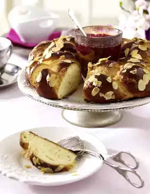 Whisk the egg yolk and cream, spread on the wreath. Sprinkle with flaked almonds. Bake in the preheated oven (electric cooker: 200 °C/ convection oven: 175 °C/ gas: level 3) for 20-25 minutes