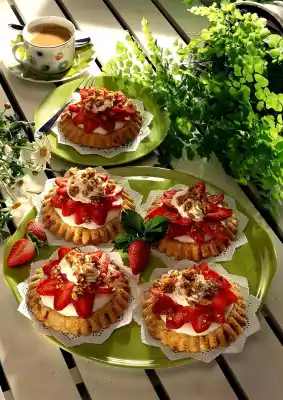 Cold. Spread the quark mixture into the tartlets and put them in a cool place for about 1 hour. Wash, clean and slice the strawberries. Warm up the jam and pass it through a sieve. Cover the tartlets with the strawberry slices and cover with jam.